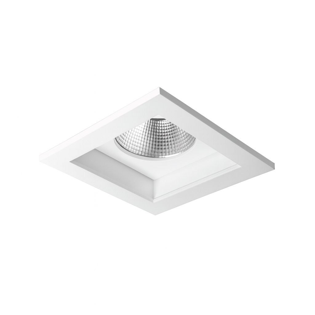 Embutido LED quadrado com foco fixo recuado. Corpo e dissipador fabricados em alumínio, acabamento em pintura eletrostática. Possui refletor em alumínio metalizado alto brilho.