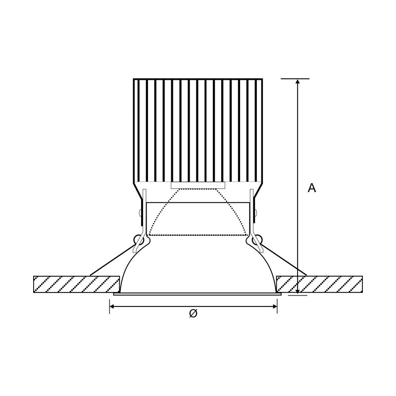 Embutido LED circular com foco fixo recuado. Corpo e dissipador fabricados em alumínio, acabamento em pintura eletrostática. Possui refletor em alumínio metalizado alto brilho.