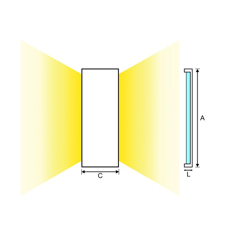 Arandela LED slim retangular difusa com duplo facho indireto, para aplicação sobreposta. Fabricado em alumínio com acabamento em pintura eletrostática. Difusor em acrílico translucido.