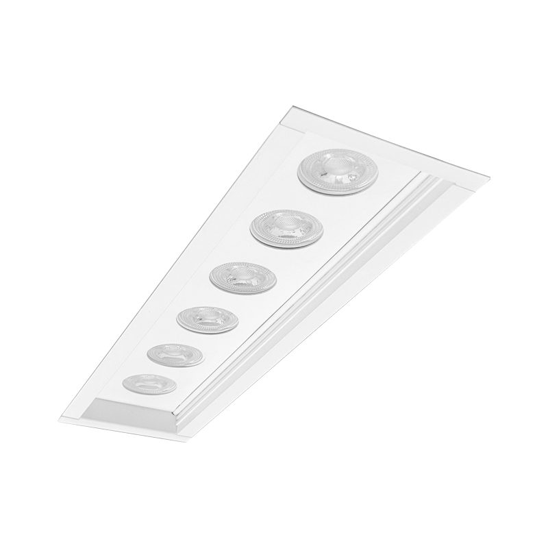Luminária retangular com foco fixo recuado, para instalação embutida em forro gesso. Corpo fabricado em perfil de alumínio extrudado, acabamento em pintura eletrostática.