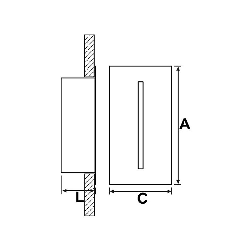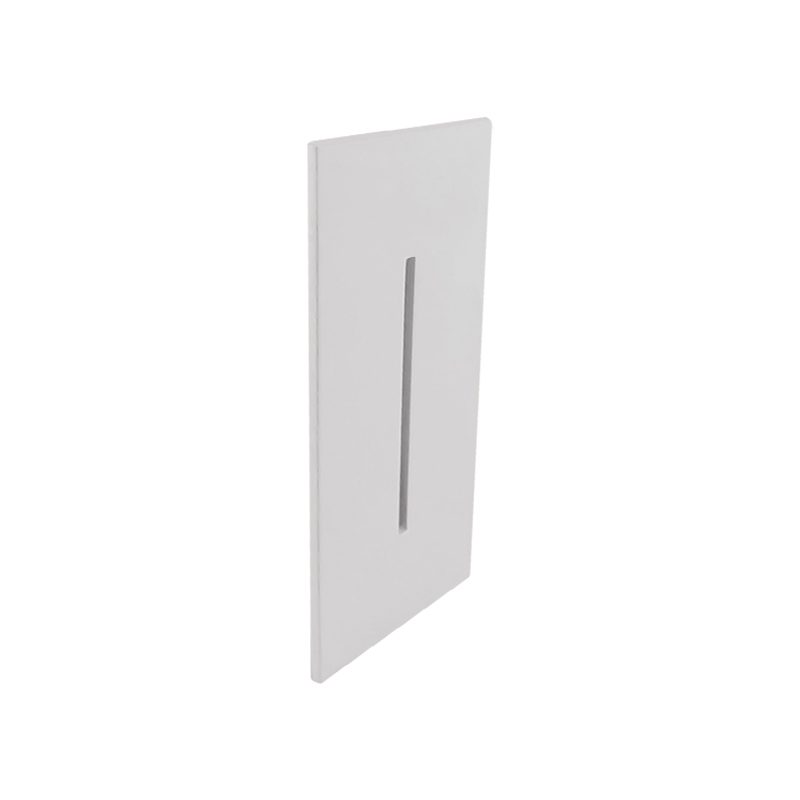 Arandela retangular com friso de balizamento, para instalação embutida em parede, uso interno. Corpo fabricado em alumínio com acabamento em pintura eletrostática.