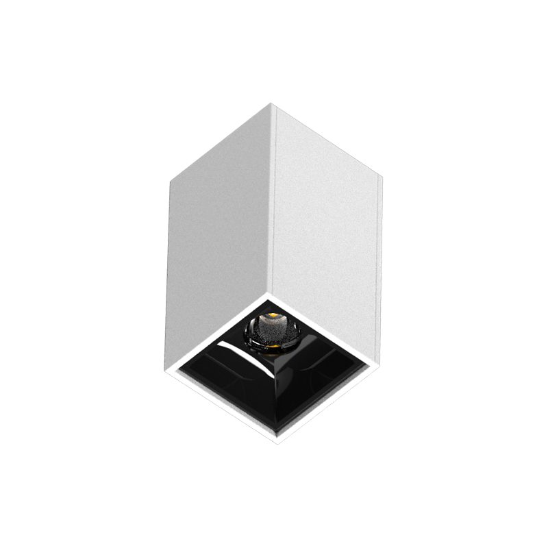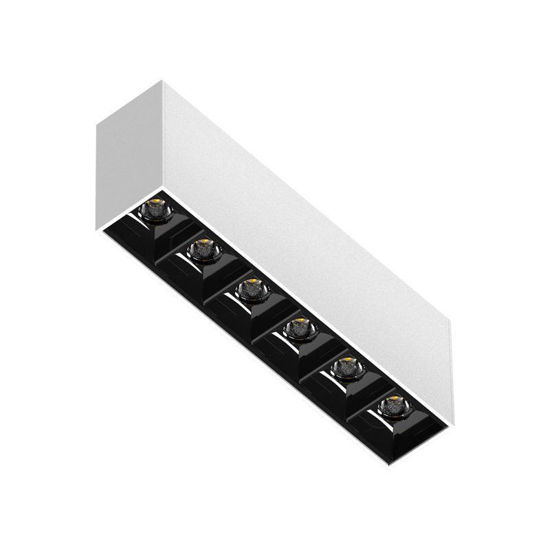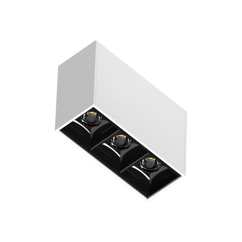 Luminária retangular com foco fixo recuado, para instalação embutida em forro gesso. Corpo fabricado em perfil de alumínio extrudado, acabamento em pintura eletrostática.