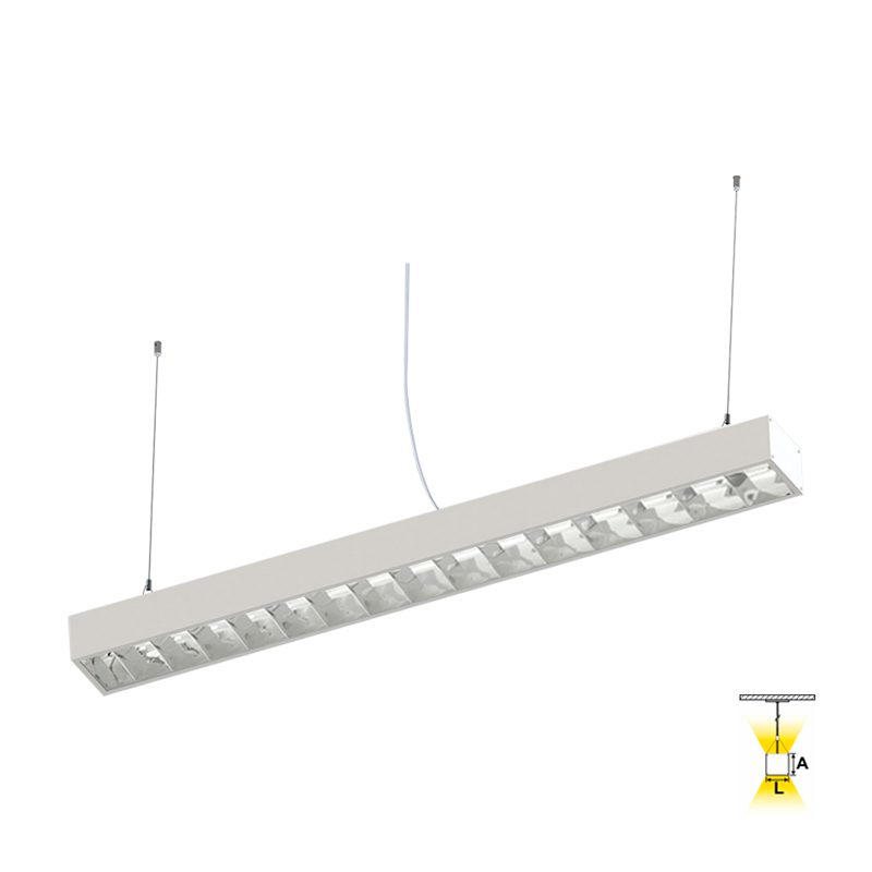 Luminária linear com iluminação difusa direta e indireta, para instalação pendente. Corpo fabricado em perfil de alumínio, acabamento em pintura eletrostática. Refletor com aletas parabólicas em alumínio metalizado. Suspenso por cabos de aço e cabo PP com regulagem de comprimento.