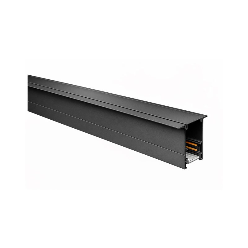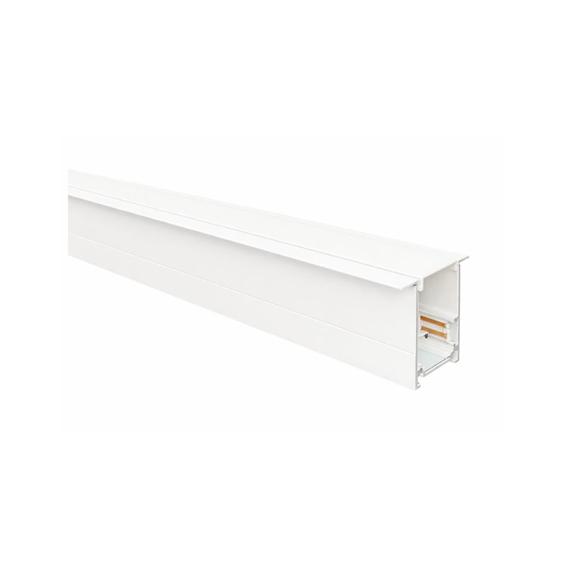 Trilho magnético eletrificado de 1 circuito, para instalação embutida em forro. Corpo fabricado em alumínio, com acabamento em pintura eletrostática.