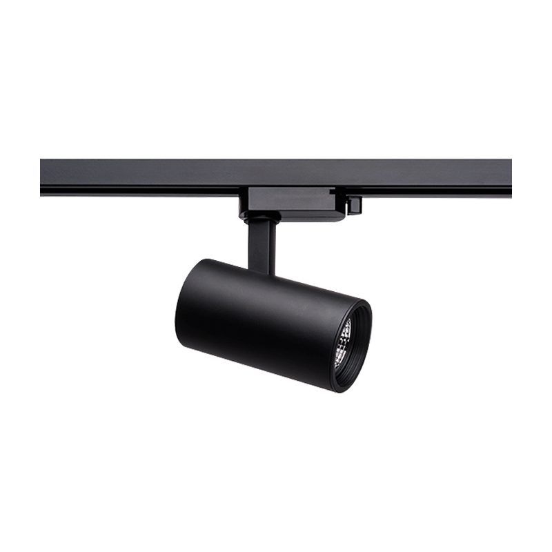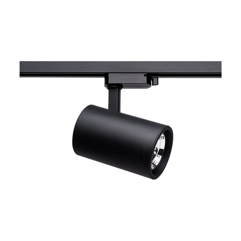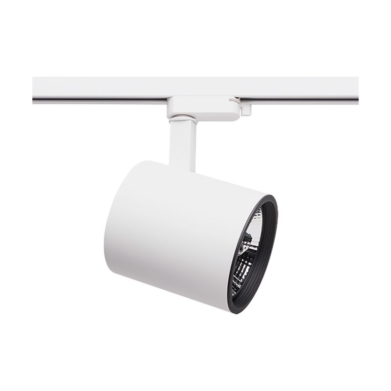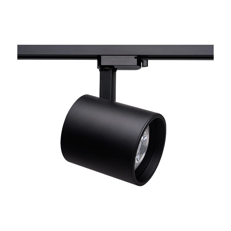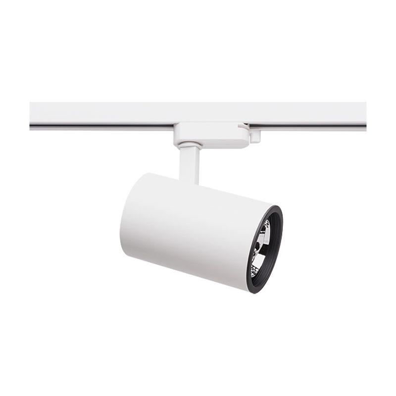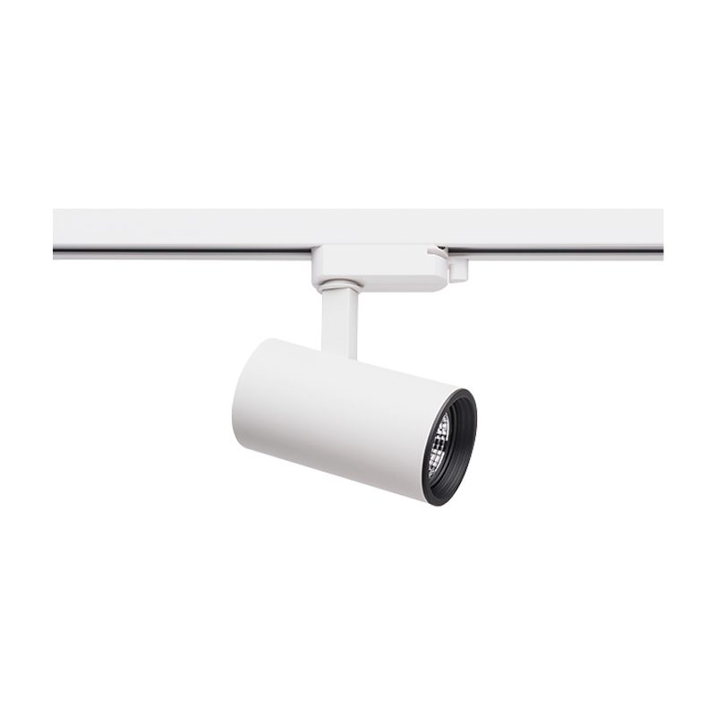 Spot projetor com foco direcionável para fixação em trilho eletrificado. Corpo e anel antiofuscante fabricados em alumínio, acabamento em pintura eletrostática.