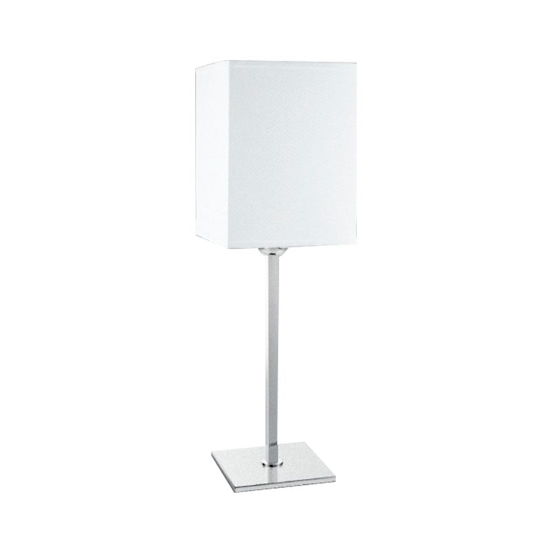 Abajur de mesa, fabricado em latão com acabamento polido e cromado ou em pintura por processo eletrostático. Cúpula retangular com estrutura em metal aramado envolto em tecido.