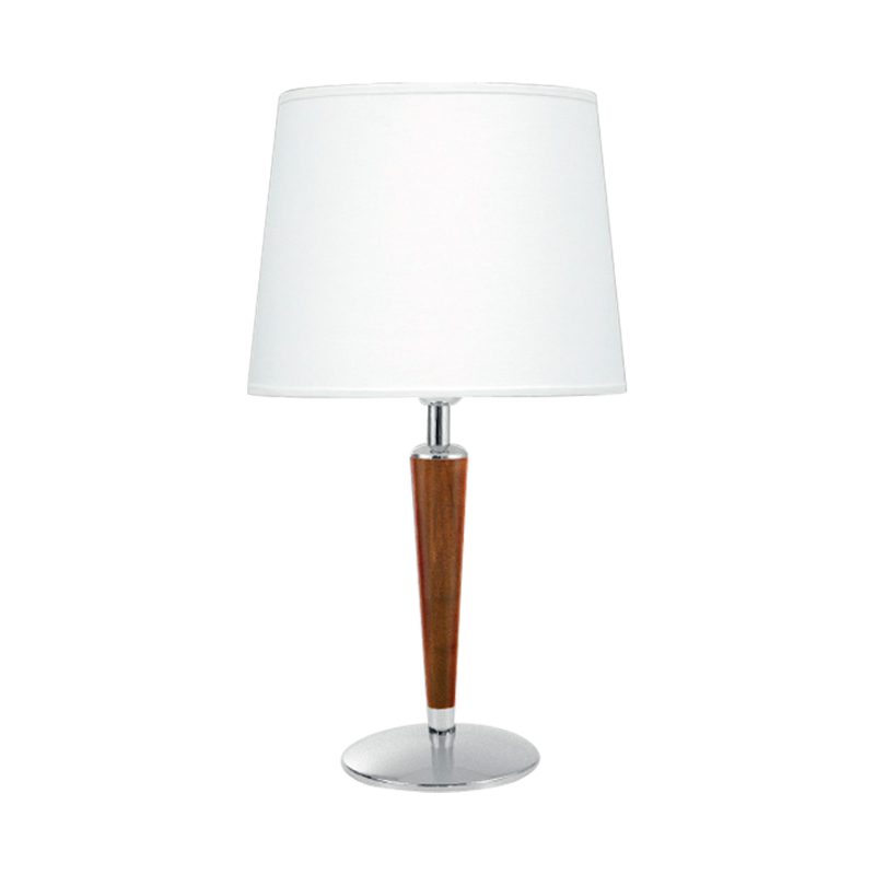 Abajur de mesa fabricado em madeira nobre, detalhes em latão com acabamento polido e cromado. Cúpula cônica com estrutura em metal aramado envolto em tecido.