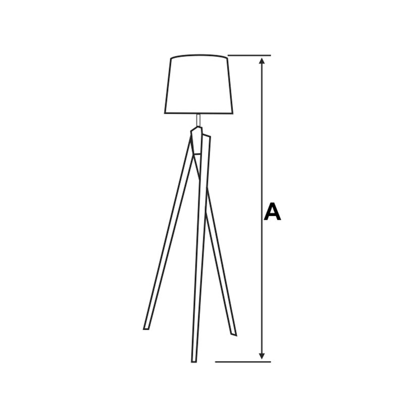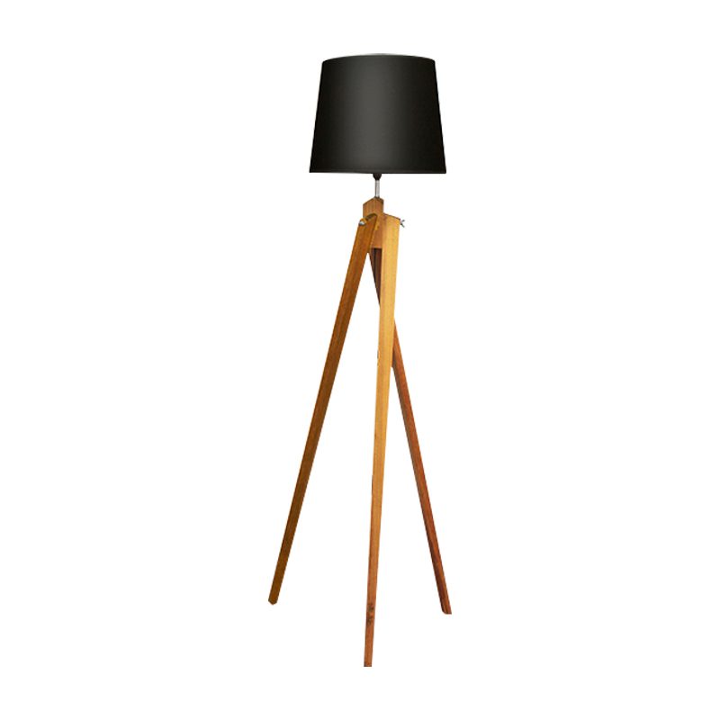 Abajur de piso estilo tripé. Corpo fabricado em madeira nobre. Cúpula cônica com estrutura em metal aramado envolto em tecido com diversos acabamentos.